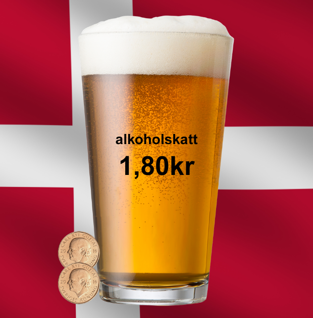 Danmark tar ölskatt per liter ren alkohol: 48,74 DKK per liter 100% alkohol.