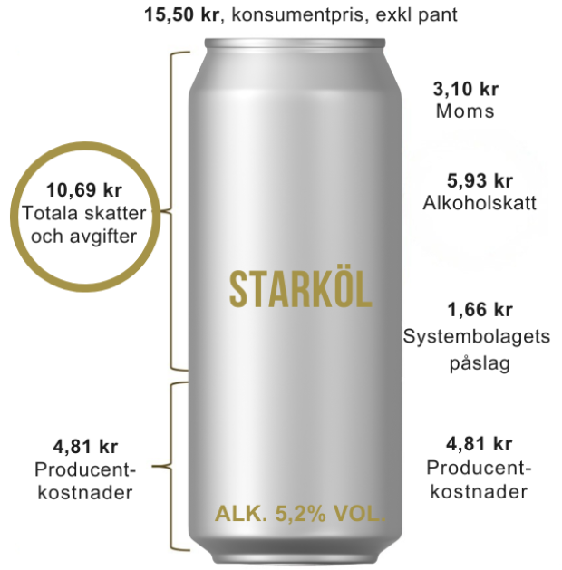 För en 50 cl burk starköl med en alkoholhalt på 5,2 volymprocent inköpt på Systembolaget för 15:50 kr uppgår skatter och avgifter till totalt 10,69 kr.